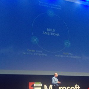The three ambitions he revealed are not about replacing people with machines, but empowering people to do more with their businesses, and were detailed as being: reinvent productivity and business processes; create more personal computing; and build the intelligent cloud platform.